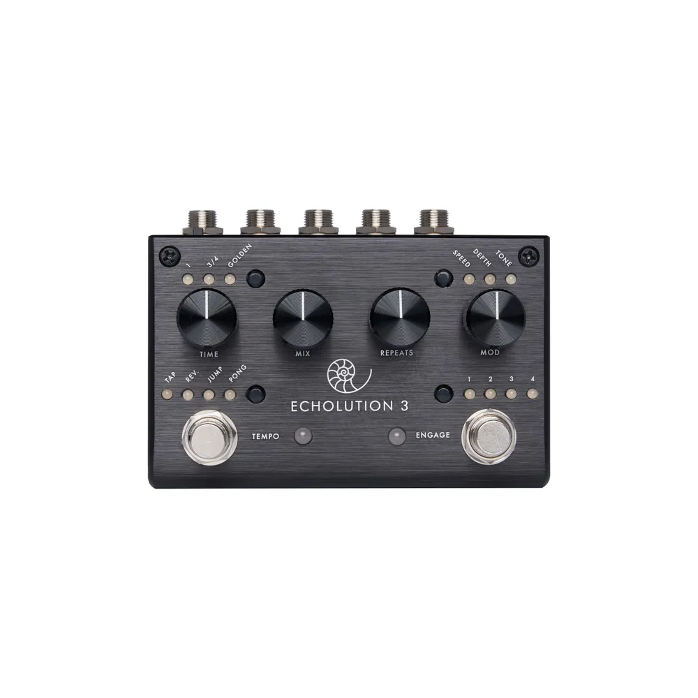 Echolution 3 is a multi-tap stereo modulation delay offering a myriad of sound design options including reverse, jump, pong, modulation tempo sync, variable low pass filter, flexible signal routing and comprehensive MIDI control. Delay times ranging from 100ms to 5 seconds can be dialed in using the Time knob or via Tap Tempo using the left footswitch. A second delay tap can be set to the same length or a fraction of the main delay time to create rhythmic echoes. The ¾ fraction creates a dotted eight note delay, while the Golden fraction uses the sacred geometry of the Golden Ratio (.382) as the multiplier for the second tap. The multi-tap settings can be even further enhanced by the stereo ping pong effect, which causes the different delay taps to switch sides on each repeat. Store up to 4 presets, unlock hidden features with the Universal Remote footswitch, and design yet unheard delay lines. Runs on standard 9VDC.
