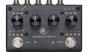 Echolution 3 is a multi-tap stereo modulation delay offering a myriad of sound design options including reverse, jump, pong, modulation tempo sync, variable low pass filter, flexible signal routing and comprehensive MIDI control. Delay times ranging from 100ms to 5 seconds can be dialed in using the Time knob or via Tap Tempo using the left footswitch. A second delay tap can be set to the same length or a fraction of the main delay time to create rhythmic echoes. The ¾ fraction creates a dotted eight note delay, while the Golden fraction uses the sacred geometry of the Golden Ratio (.382) as the multiplier for the second tap. The multi-tap settings can be even further enhanced by the stereo ping pong effect, which causes the different delay taps to switch sides on each repeat. Store up to 4 presets, unlock hidden features with the Universal Remote footswitch, and design yet unheard delay lines. Runs on standard 9VDC.